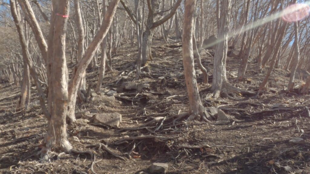 帰りは同じルートを戻ります。 樹林帯に入ると風が弱まり、落ち着いた雰囲気に戻りました。